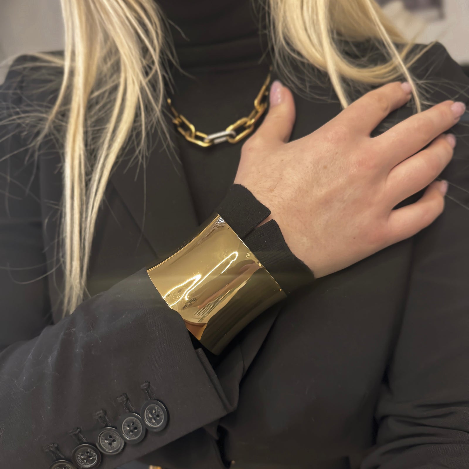 Trage die stilvolle ATENA Armspange aus Edelstahl und genieße ihr einzigartiges Design! Die breite Armspange ist der perfekte Stylingtipp zu minimalistischer Kleidung - egal ob einfarbiges Oberteil oder dunkles Strickkleid. Setze ein edles Statement und zeige deine Leidenschaft für Qualität und Design.