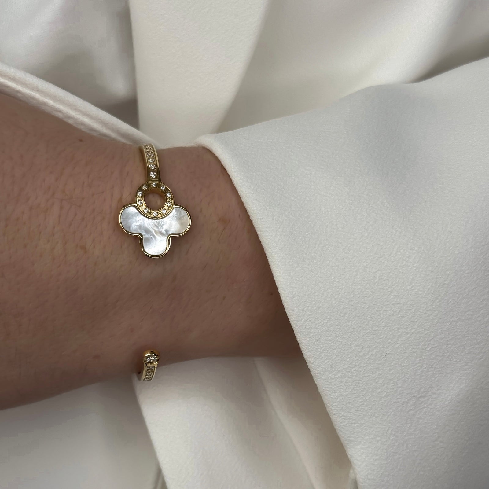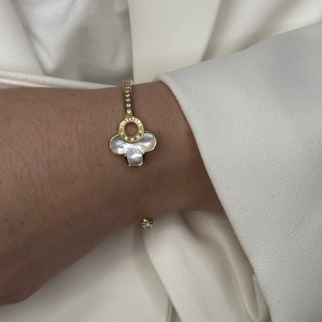 The CHIAVE bangle is an elegant accessory made of stainless steel with our unique clover leaf design. High-quality workmanship and 14 K gold plating, it is not only waterproof, but also timeless and stylish. For a touch of luxury and luck in your everyday life!