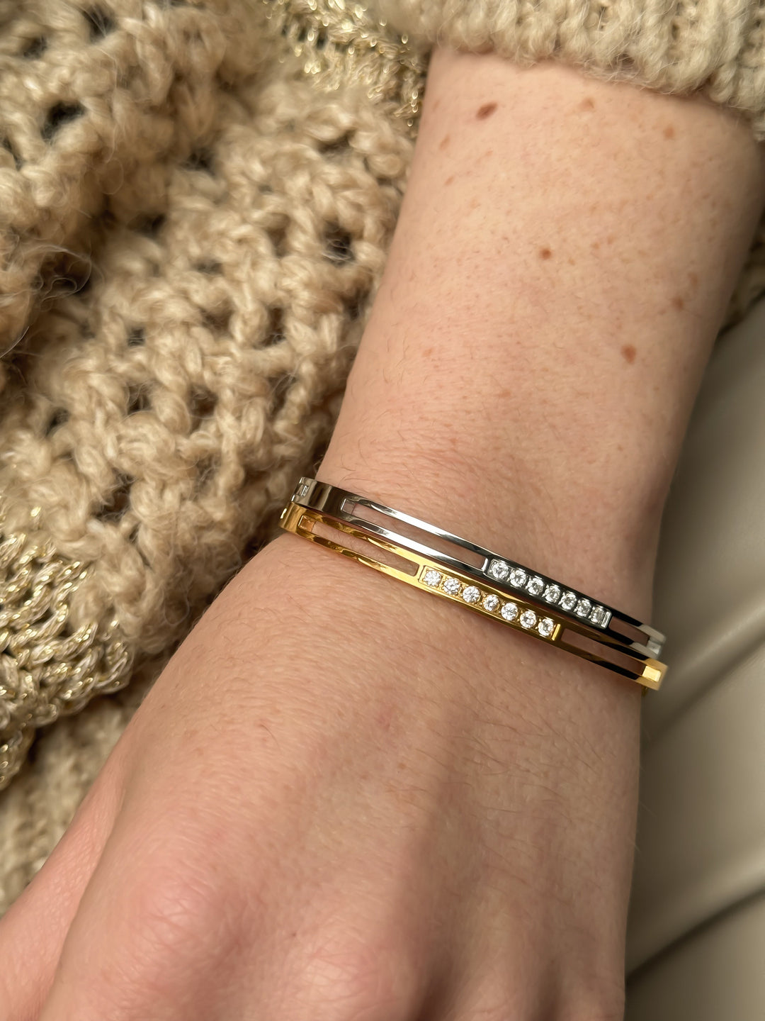 Der SOLE Armreif ist die perfekte Ergänzung für jedes Outfit. Sein hochwertiges Design aus Edelstahl und funkelnden Zirkonia Steinen machen ihn zu einem glanzvollen Blickfang. Dieser Armreif ist ein Statement für Eleganz und Raffinesse.