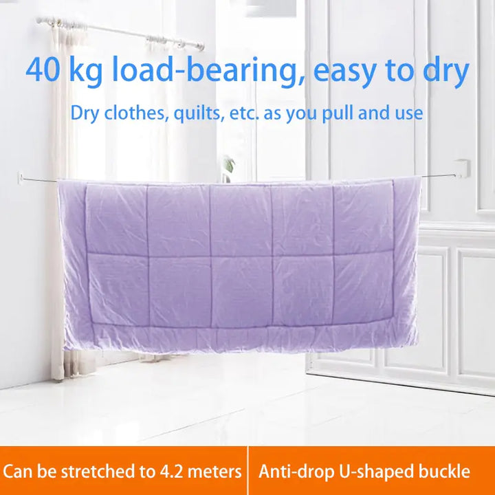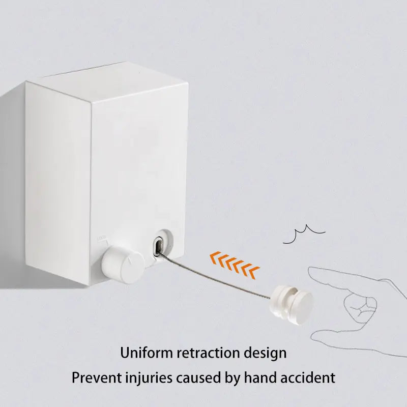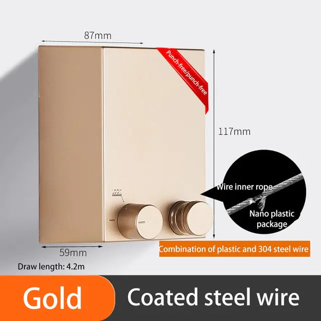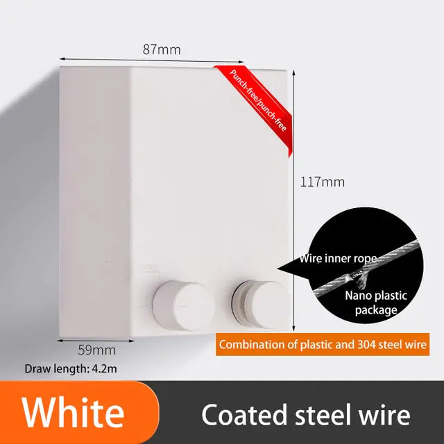 „Revolutionieren Sie Ihre Wäscheroutine mit unserer stanzfreien, einziehbaren Wäscheleine. Dieser wandhängende Wäscheständer ist perfekt für Hotels, Privathaushalte oder jeden anderen Raum, in dem platzsparende Lösungen unverzichtbar sind, und ist ein echter Game-Changer. Er ist aus robustem Stahldraht gefertigt und sein einziehbares Design sorgt dafür, dass Ihr Wäschebereich organisiert und aufgeräumt bleibt, wenn er nicht verwendet wird. Verabschieden Sie sich von sperrigen Wäscheständern und begrüßen Sie nahtlose, unsichtbare Organisation. Vereinfachen Sie Ihre Wäscheaufgaben mit unserer innovativen stanzfreien, einziehbaren Wäscheleine.“
