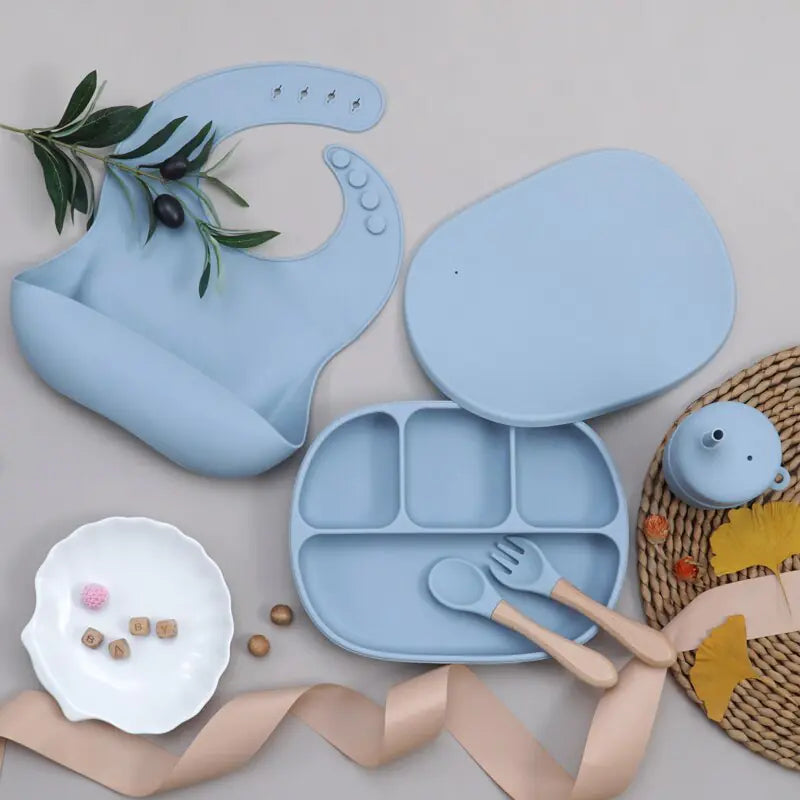 Wir präsentieren unser umfassendes 5-teiliges Kindergeschirrset aus Silikon, die perfekte Lösung für eine problemlose Babyfütterung. Dieses Set enthält eine vielseitige Auswahl an wichtigen Artikeln, die die Mahlzeiten zu einem Kinderspiel machen: einen Teller mit festem Essgeschirr und Deckel, ein wasserdichtes Lätzchen, eine Gabel, einen Löffel und einen Schnabelbecher. Diese Artikel sind aus sicherem und langlebigem Silikon gefertigt und halten den Strapazen des täglichen Gebrauchs stand, während sie Ihrem Baby ein sauberes und angenehmes Esserlebnis bieten. Verbessern Sie die Fütterungsroutine Ihres Kindes mit diesem praktischen und farbenfrohen Geschirrset.
