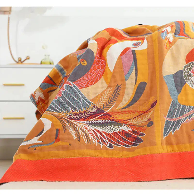 Diese Tagesdecke aus hochwertiger Baumwolle strahlt luxuriöse Weichheit und Strapazierfähigkeit aus und sorgt das ganze Jahr über für Komfort und Stil. Ihr exquisites Design zeigt eine entzückende Auswahl tropischer Vögel und üppiger Blumen und erinnert an die ruhige Schönheit eines tropischen Gartens in voller Blüte.