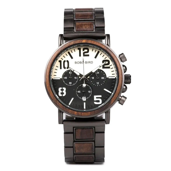 Unsere mit Präzision und Liebe zum Detail gefertigte Holzuhr verfügt über eine Chronographenfunktion, mit der Sie die Zeit genau und stilvoll im Auge behalten können. Ob bei der Arbeit, auf einem Wochenendabenteuer oder bei einem besonderen Event, diese Uhr ist der perfekte Begleiter für jeden Moment.