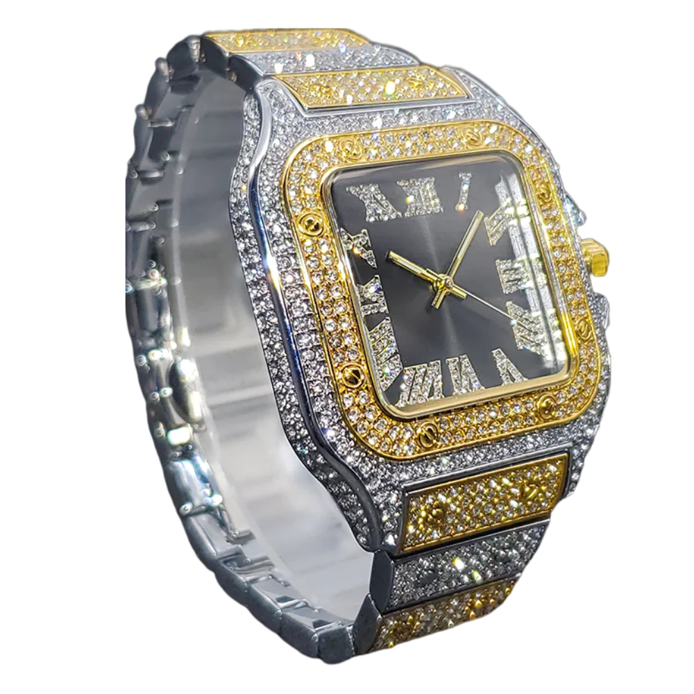 Werten Sie Ihren Stil mit dem exquisiten Charme von Iced Out Square-Uhren auf, die eine faszinierende Mischung aus Gold- und Silbertönen mit schillernden Kristallen aufweisen. Diese atemberaubende Kombination verbindet mühelos Eleganz mit modernem Flair und schafft ein zeitloses Accessoire, das Luxus und Raffinesse ausstrahlt.