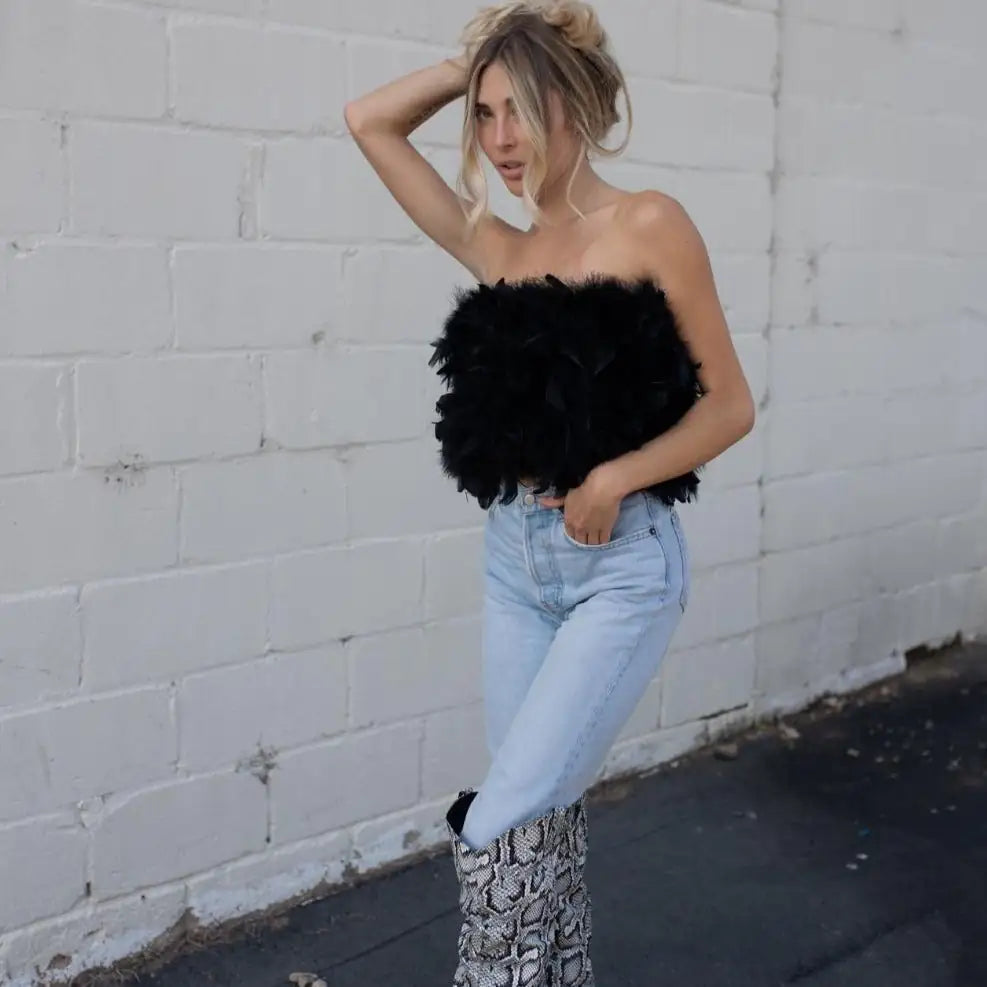 Verwandeln Sie Ihre Garderobe mit dem Bea Feather Top, das Ihr lässiges oder elegantes Ensemble mühelos aufwertet und Sie durch seine elegante Schlichtheit aus der Masse hervorstechen lässt.
